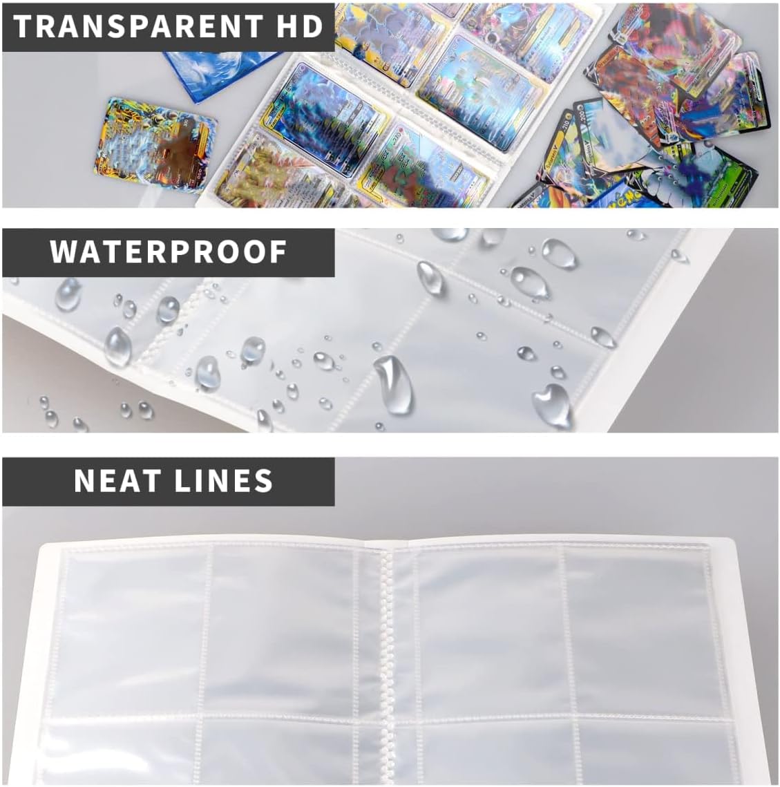 Premium Materials – Card binder made of durable and waterproof PP material, so that the cards will not bend, strong and durable. Can protect your favorite cards well. Card Holder Size: 32.5cm x 20cm Individual inner pocket size: 9.5cm x 6.8cm